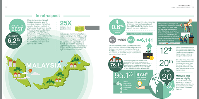 “The government will build more than 3,000km of paved roads in rural areas between 2016 to 2020,” said Prime Minister Najib Razak in the 2015 budget. He added, “The 11MP, with a budget of RM260 billion (about US$96 billion), aims to increase investment and employment in the five economic corridors in the country, namely Iskandar Malaysia, Sabah Development Corridor, East Coast Economic Region, Northern Corridor and the Sarawak Corridor of Renewable Energy (SCORE).”